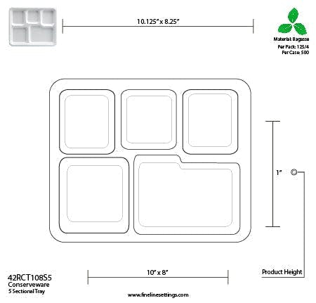 10" x 8" Compostable 5 Compartment Trays | White | School Lunch Tray | Case of 400